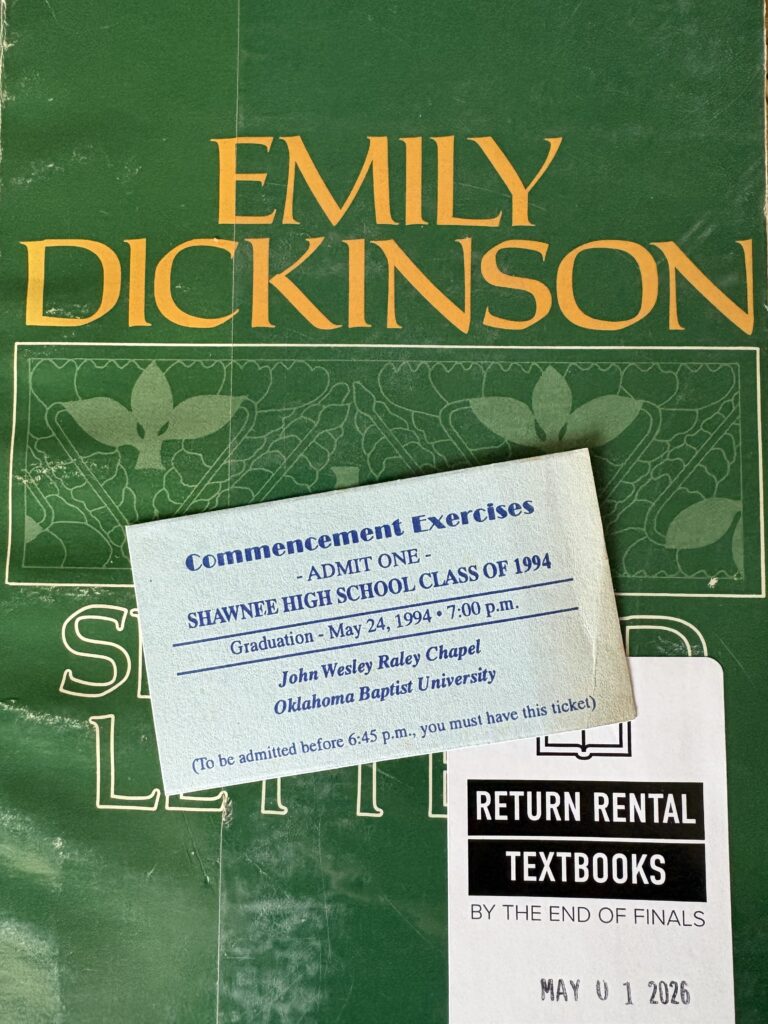 I opened my book of ED’s letters from the UMW bookstore and this Oklahoma high school graduation ticket from 1994 popped out. I don’t have much to say, but I think it is so special that ED has traveled so far from her home is Massachusetts.
