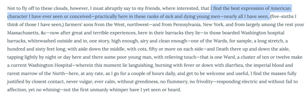 I was quickly looking at the archives, specially Whitman’s letters, and I found this letter he wrote to Ralph Waldo Emerson during the Civil War. I just think it connects so well with what we were discussing in class the past couple days in regards to Whitman and war that I had to share. The highlighted bit is something that stuck out to me: his connection to America and the soldiers. This letter definitely shows his “spiritual wound dresser” character ! (also notice the word electric again…)