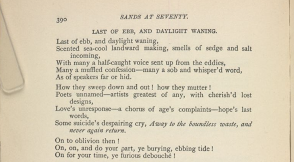 I came across this particular poem while looking through Whitman’s manuscripts (this is the published version), and wanted to share it for those who may not have read it. I find its depiction of sorrow and loss, backdropped by the ocean, incredibly beautiful.
